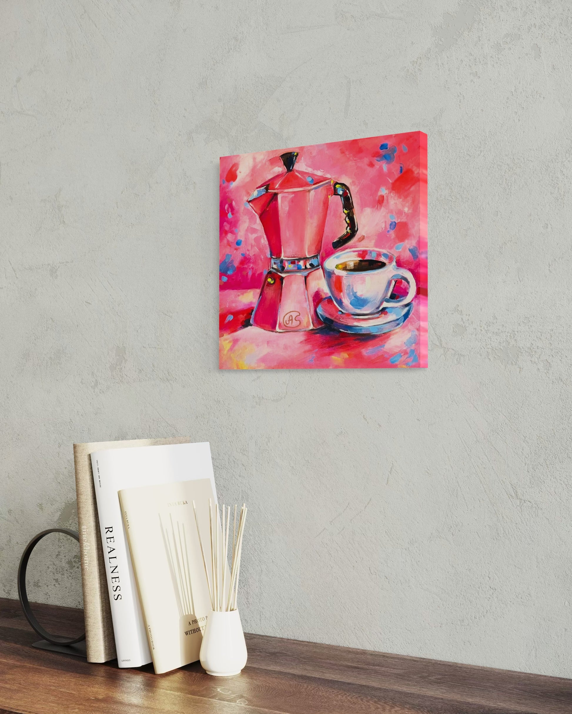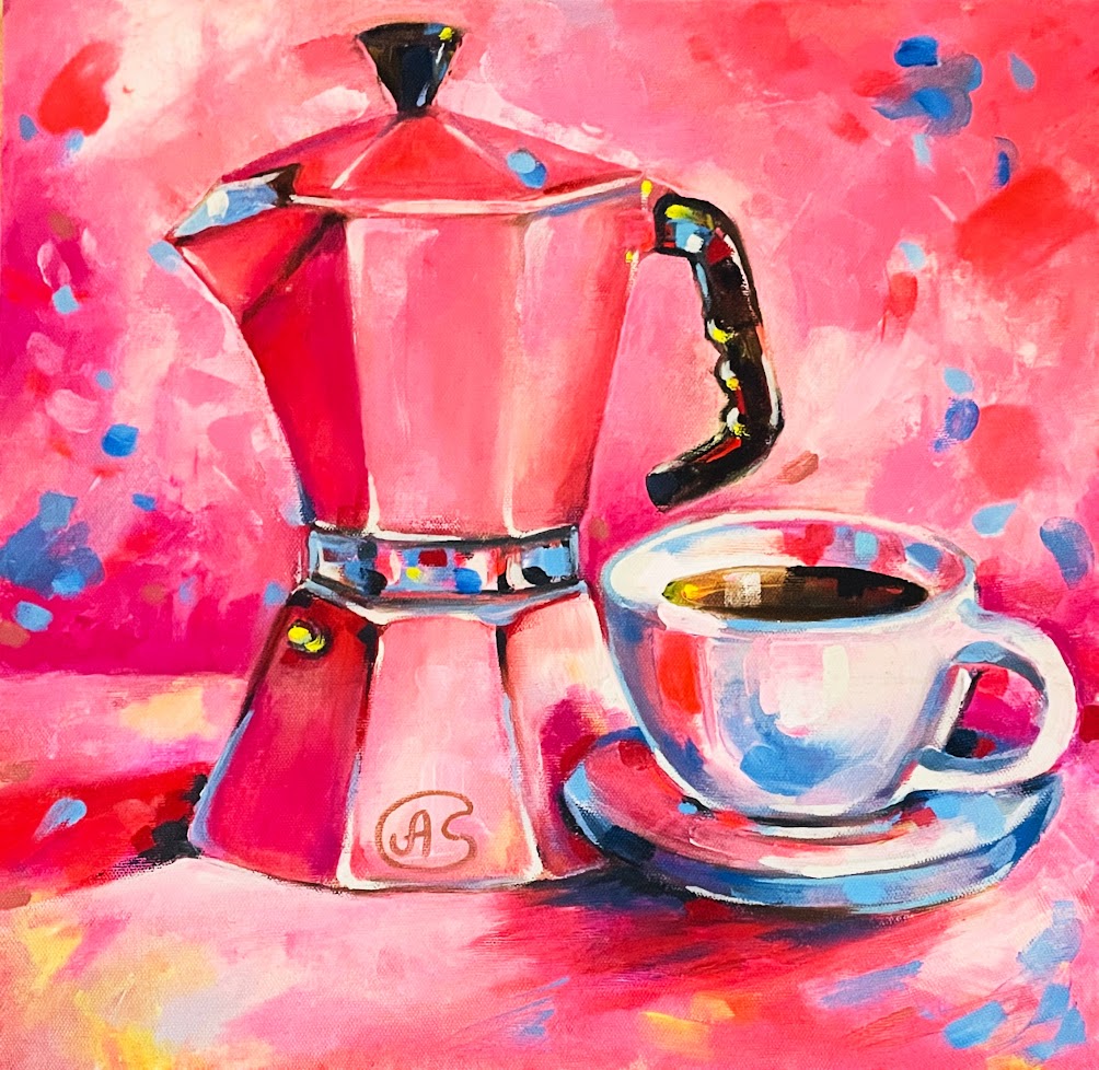 A Tender Brew is a celebration of the quiet moments that shape our days~the pause, the scent, the sip. In this piece, the moka pot and coffee cup are not merely objects but companions in a gentle ritual, wrapped in a world of warm pinks and soft reflections.