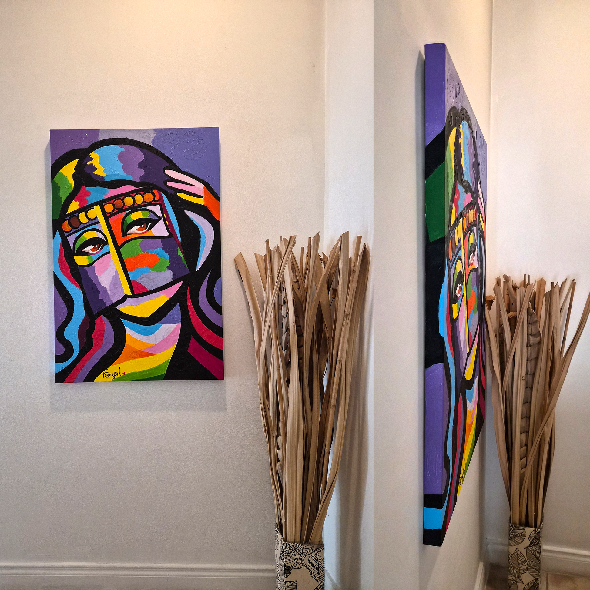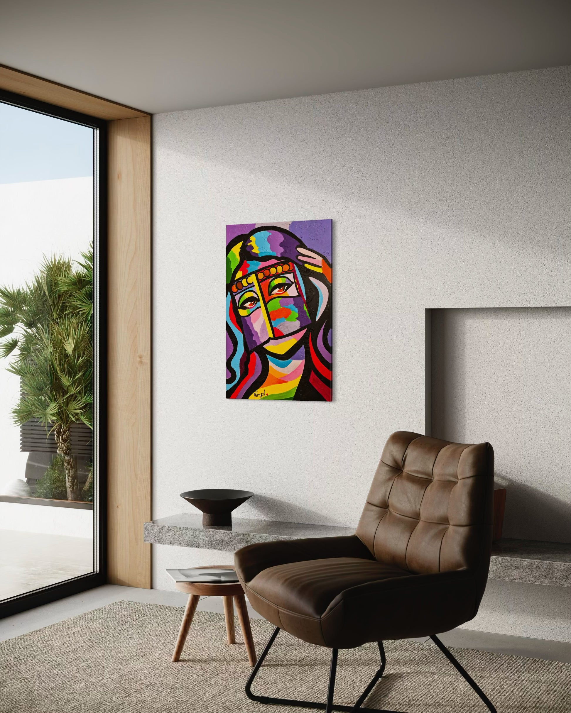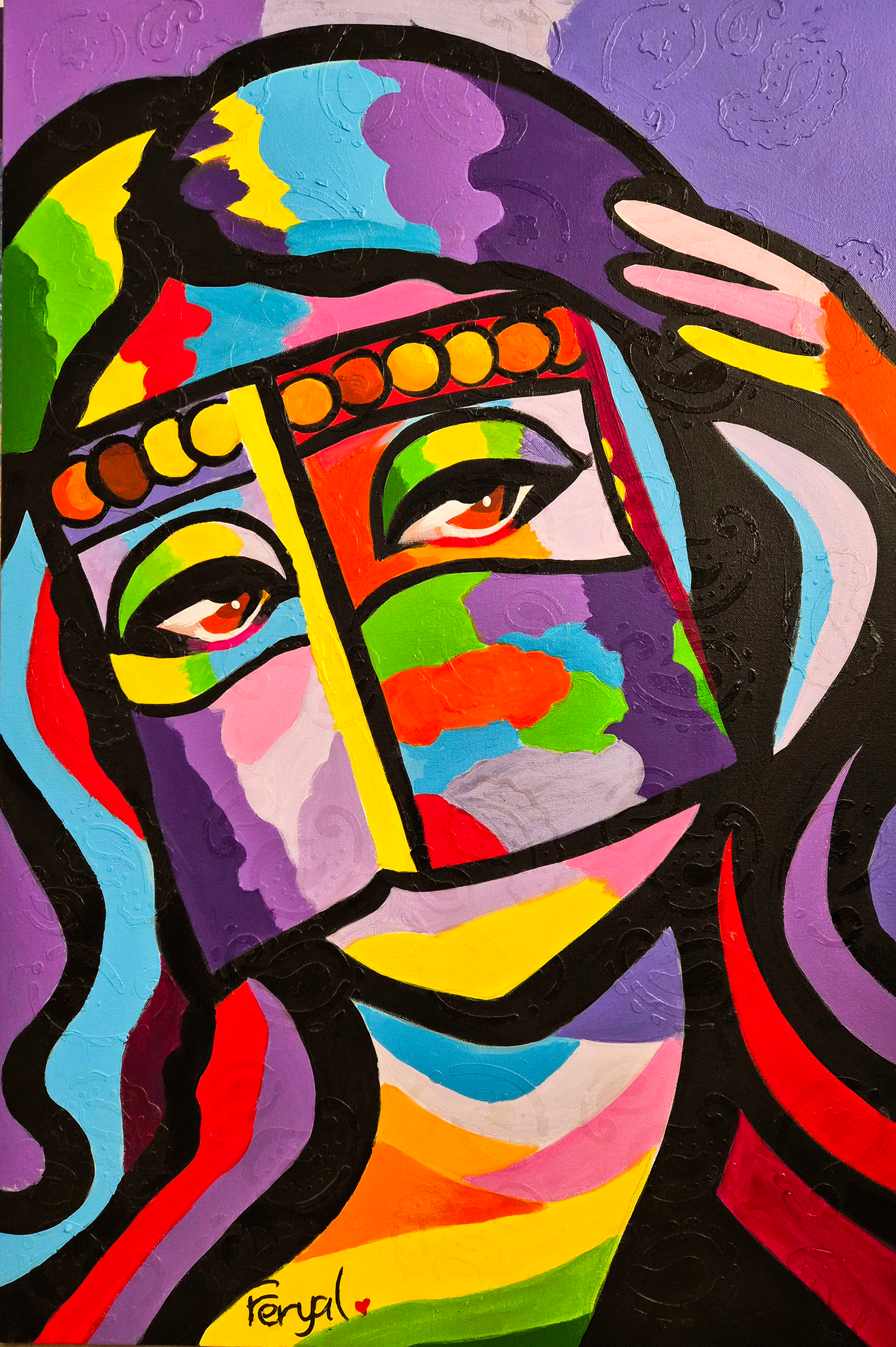 The work radiates confidence, strength, and individuality. By placing a traditionally modest symbol (the Battoola) in such a bold, colorful context, are reclaiming it as a statement of empowerment and beauty. The eyes, half-shielded yet striking, invite the viewer into a conversation between past and present, tradition and self-expression.