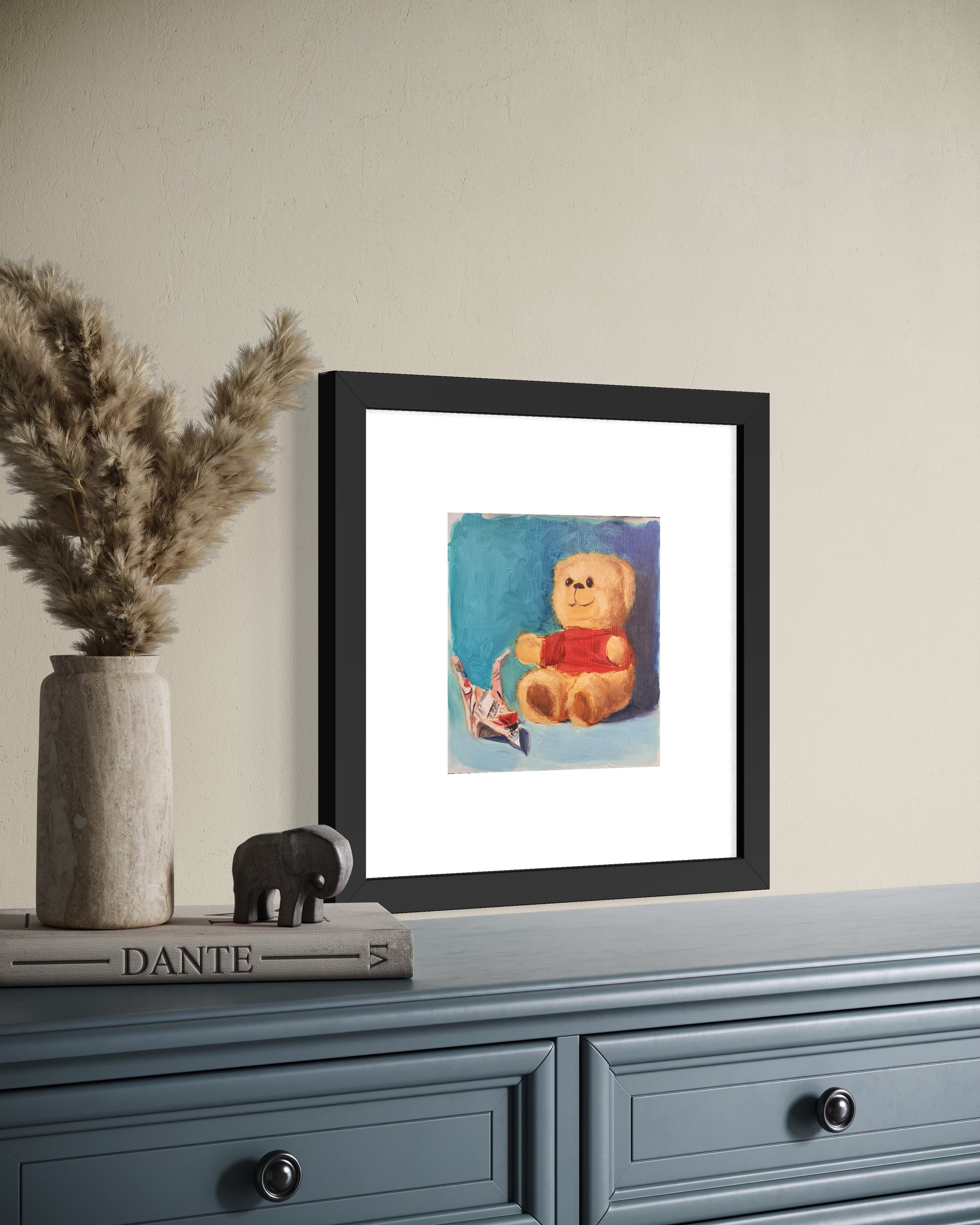 Who carries a gentle teddy bear within… and dreams held by a piece of paper? Every brushstroke in this painting speaks of nostalgia, calm, and the spontaneity of composition. The blue background is nothing but a stage for childhood memories, suspended delicately between imagination and reality.