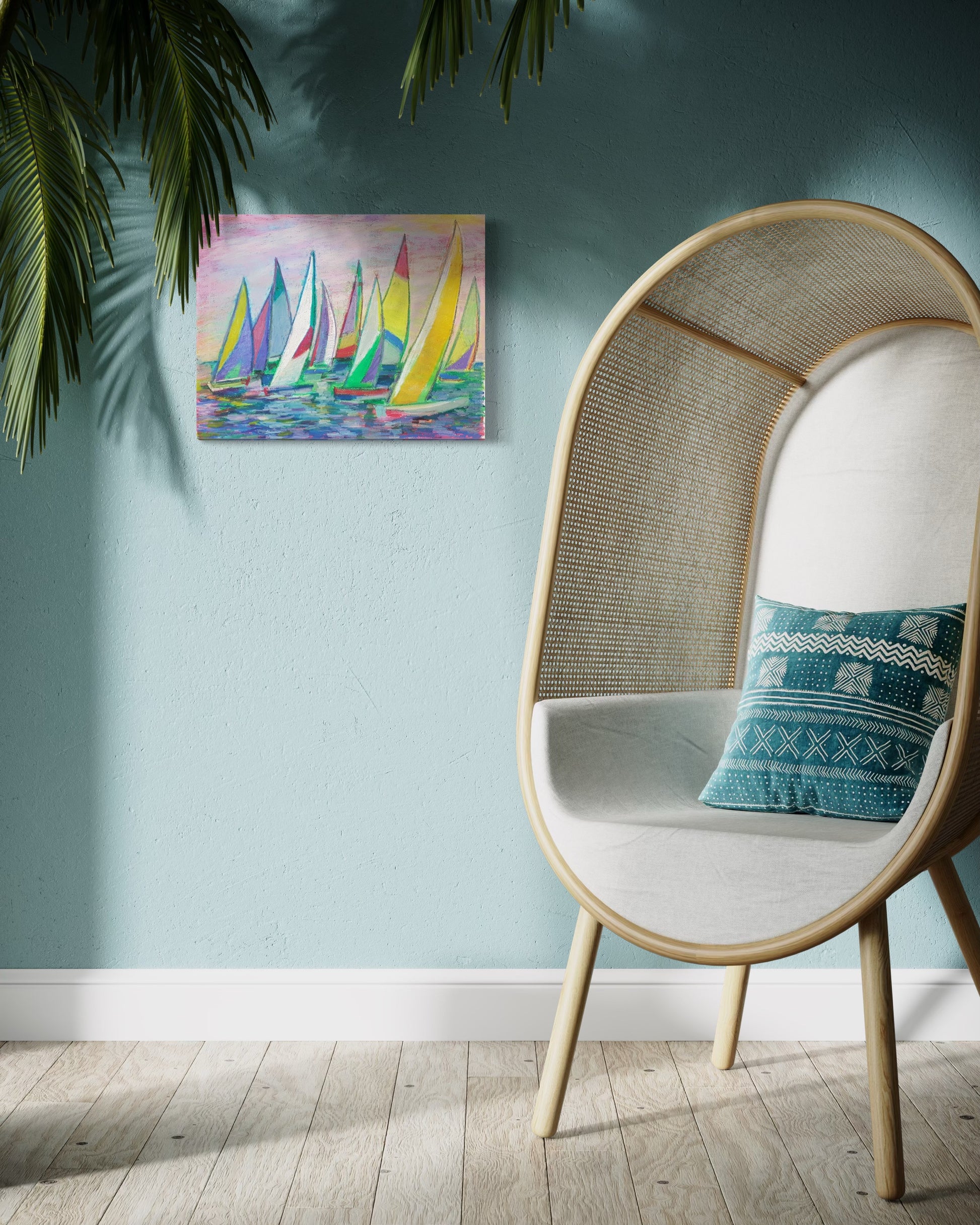 In my paintings, I use a vibrant color palette to bring the seascapes to life. The blues and greens of the ocean contrast with the warm yellows and oranges of the setting sun. The white sails of the boats stand out against the deep blue sky. These colors work together to create a sense of harmony and balance, reflecting the hope and optimism that I strive to convey through my art.