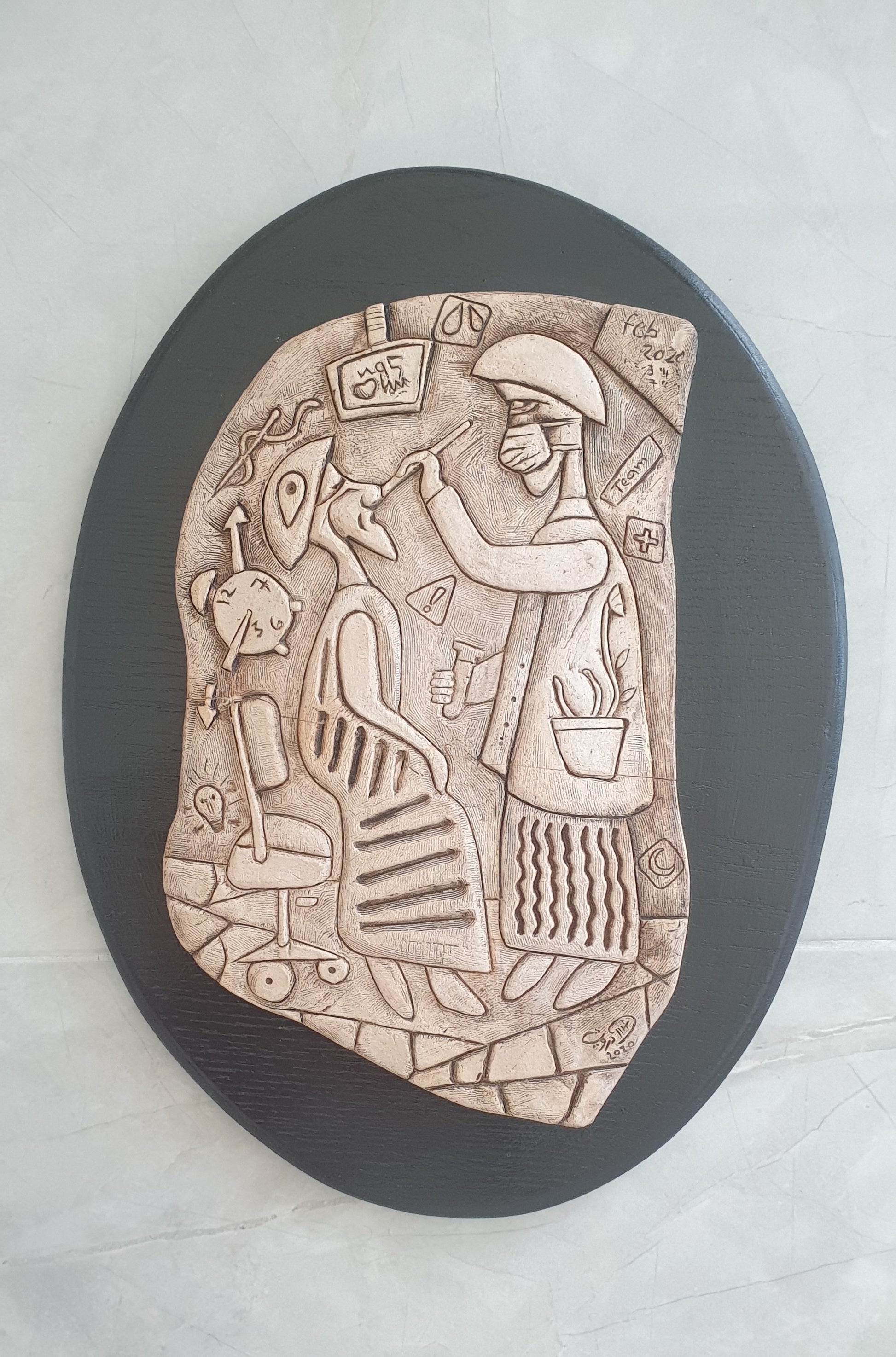 An artwork inspired by the characters of Dilmun seals, the work was crafted to connect the past and the present. It represents the vaccination phase against the coronavirus that spread around the world in 2019. The material was chosen to suggest antiquity and to anchor the event through time.