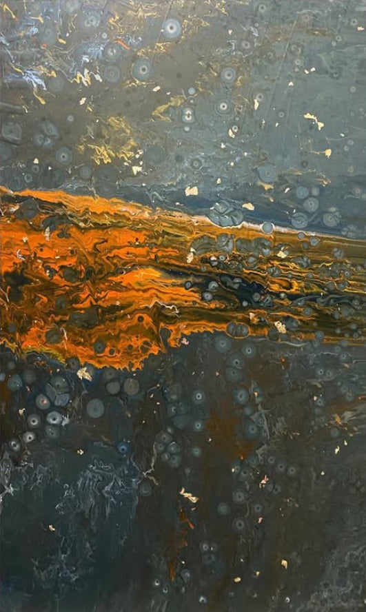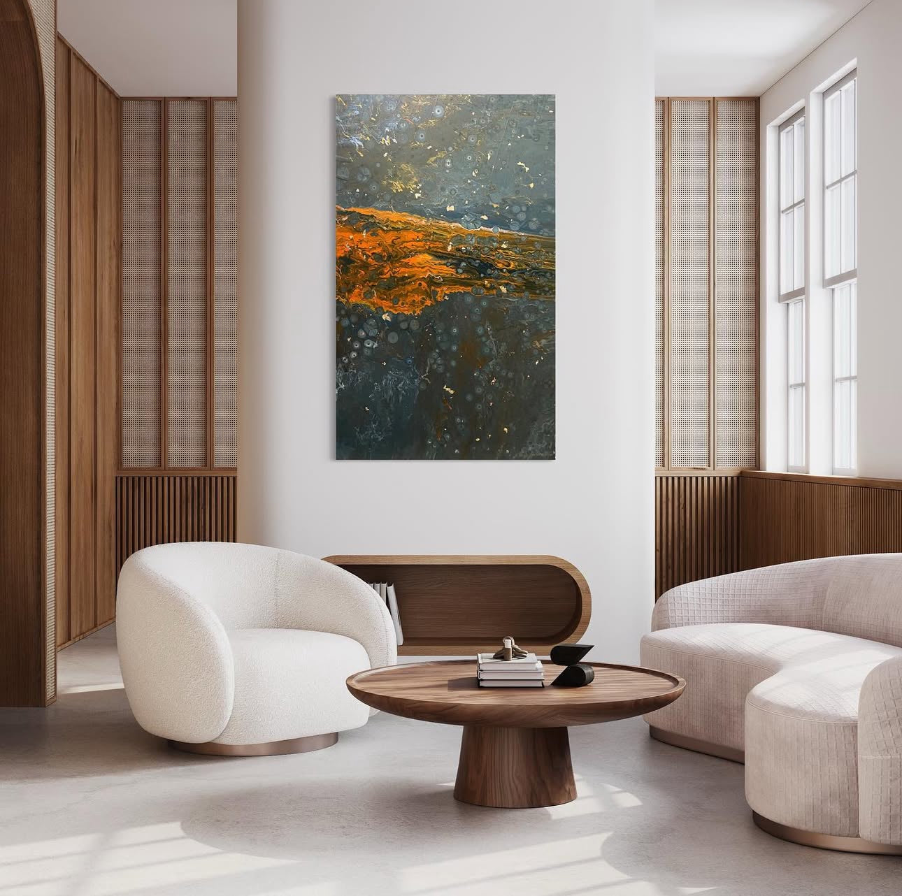 Eruption of silence explores the quiet tension of nature in motion. A streak of molten orange flows across muted gray and blue, evoking fire meeting stone. With its layered textures and subtle depth, the piece reflects balance within disruption — calm and chaos, existing together.
