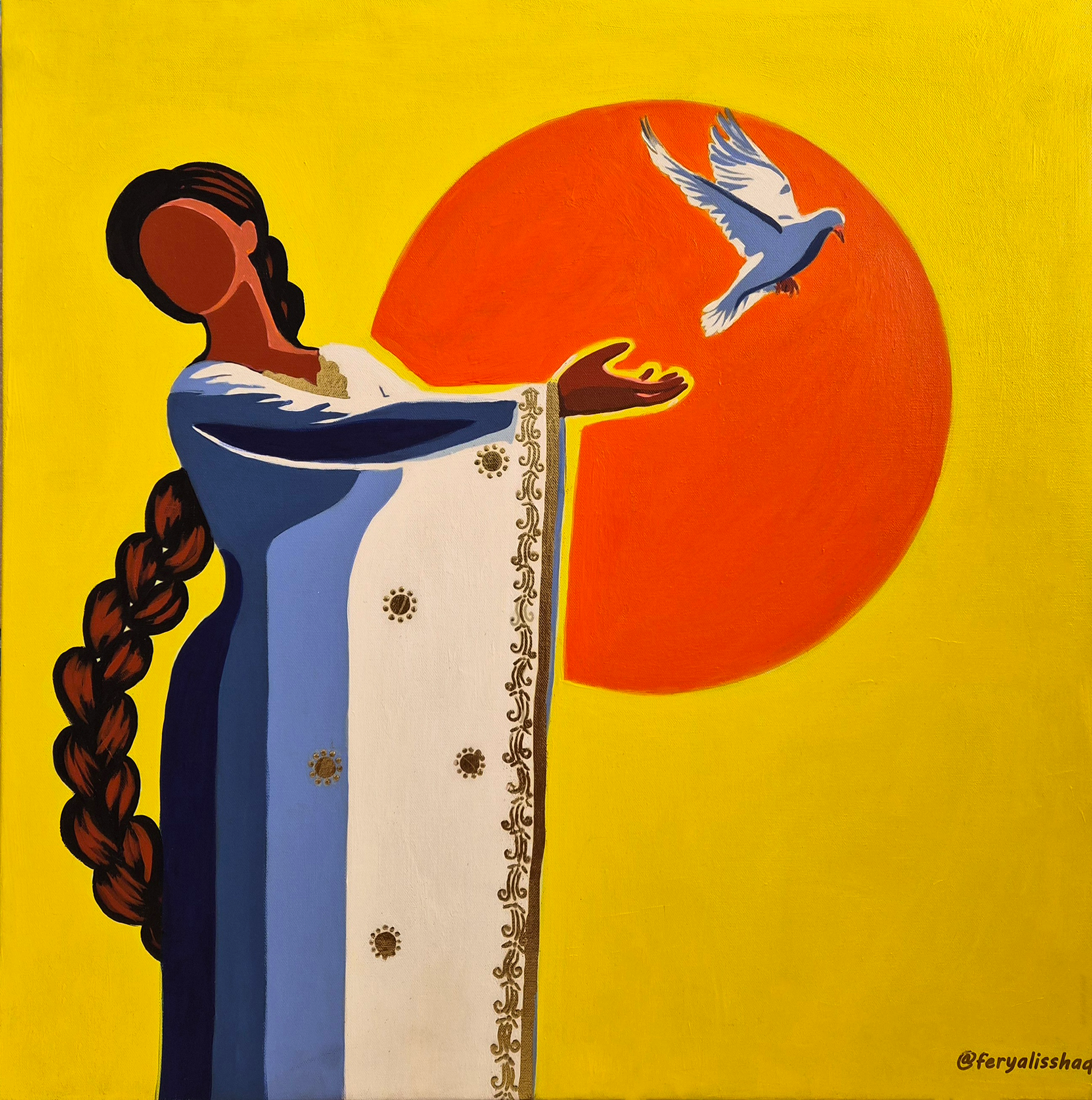 The painting features a striking, stylized composition with bold colours and clean lines. A woman with a long, thick braid cascading down her back stands gracefully, her figure elongated and elegant. She wears a traditional white Nashel thobe, adorned with golden motifs and an intricate embroidered border that runs vertically. Her arms are stretched outward, hands gently open, as if releasing or offering freedom.