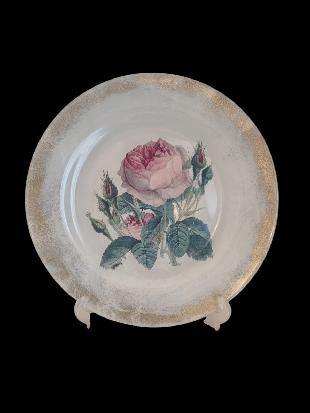 This decorative plate is an example of under-glass decoupage, a technique that creates a beautiful, protective finish. It was transformed from a simple, clear glass plate into this elegant piece. It is vintage-style, features a shabby-chic design with roses. The artwork is made from printed tissues, includes an antique background and a touch of gold leaves.,
