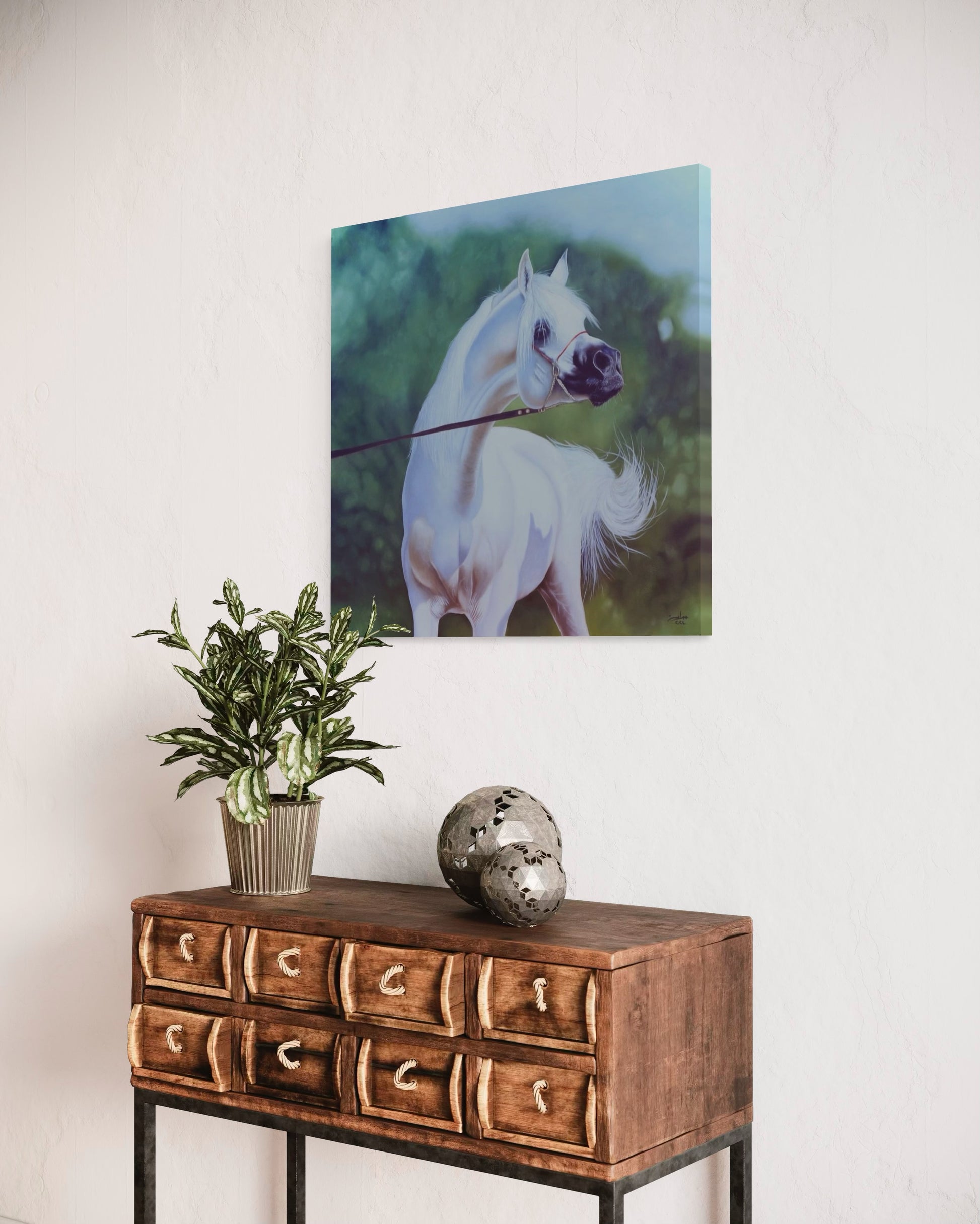This work depicts a white Arabian horse with a proud stance and a majestic presence, its lustrous hide and lustrous coat standing out against a serene natural background. A realistic depiction that expresses both purity and strength.