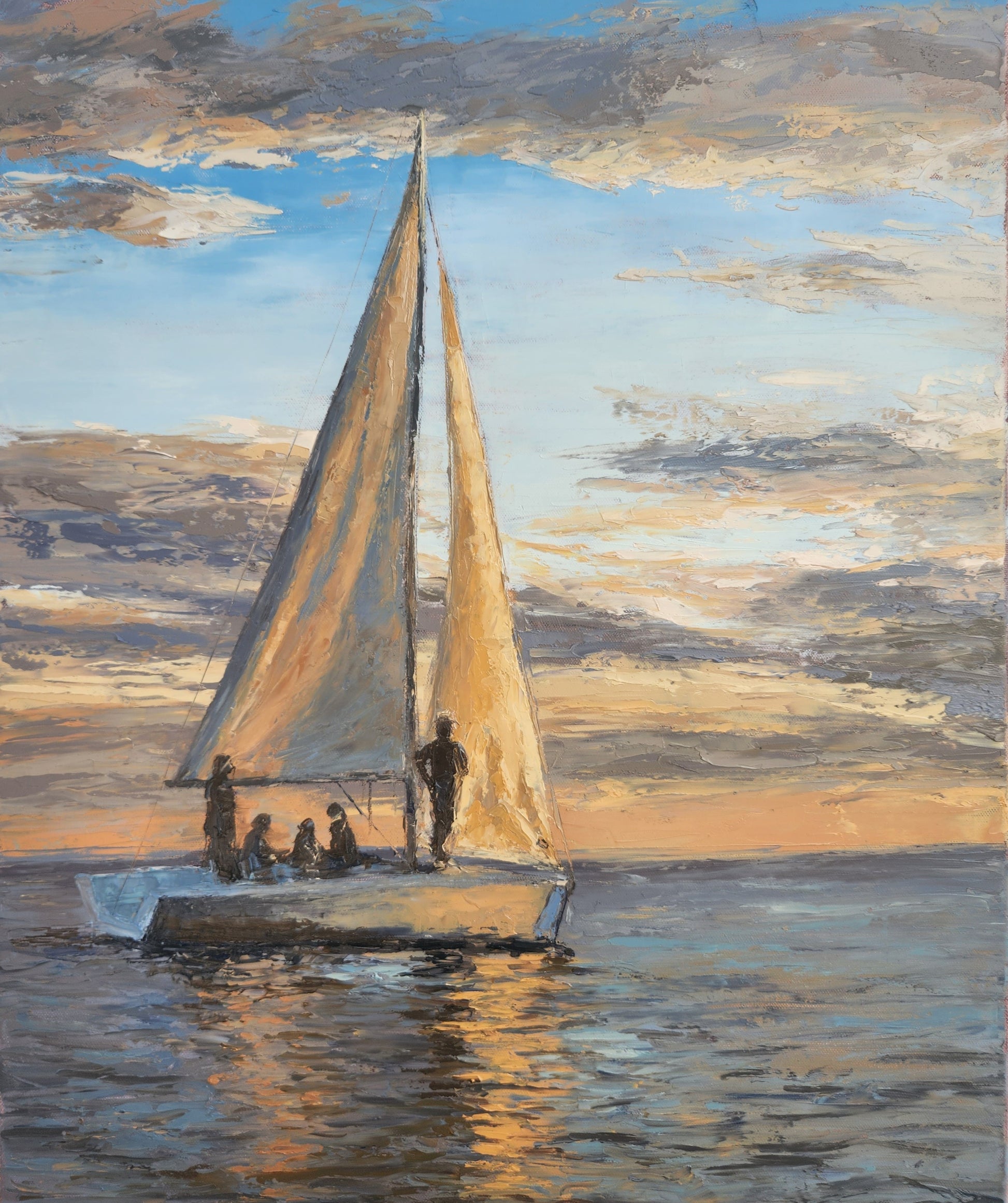 In my paintings, I use a vibrant color palette to bring the seascapes to life. The blues and greens of the ocean contrast with the warm yellows and oranges of the setting sun. The white sails of the boats stand out against the deep blue sky. These colors work together to create a sense of harmony and balance, reflecting the hope and optimism that I strive to convey through my art.
