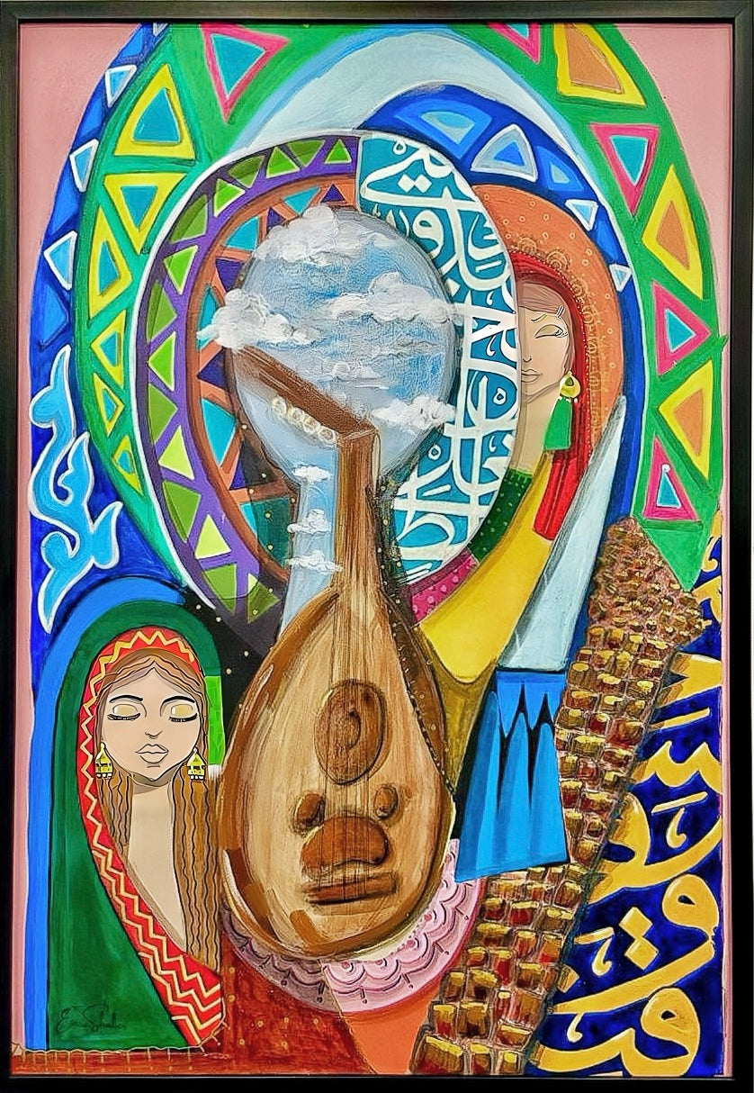 The artist adopted a symbolic style that evokes elements of Gulf heritage such as traditional attire, jewellery, Arabic calligraphy, and palm trees, placing the oud as the central focus of the scene, while the use of vivid and bold colors adds a modern impression that bridges authenticity with contemporaneity.