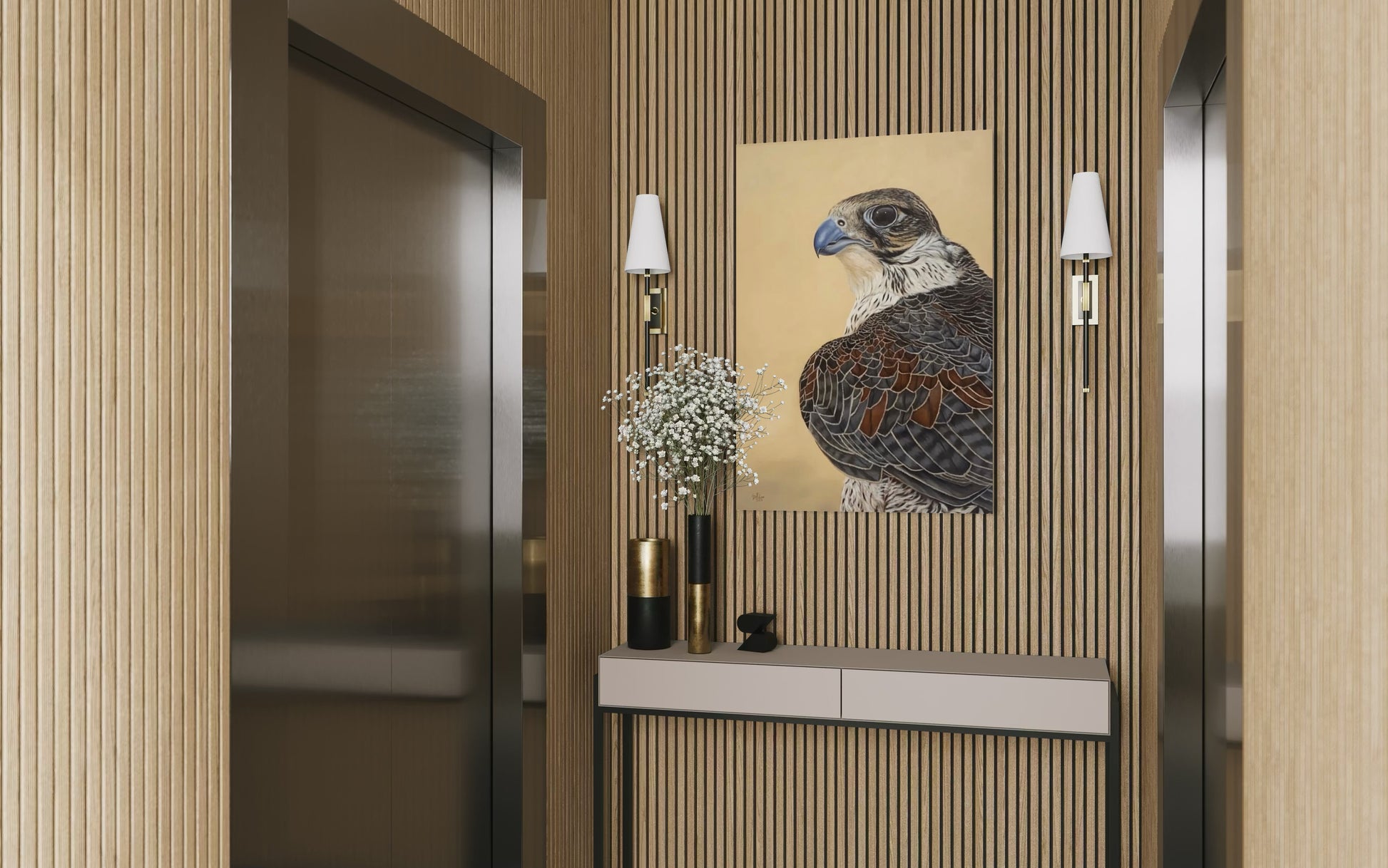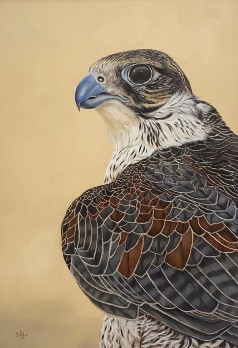 This is a realistic, accurate work that captures the beauty of the Arabian falcon, a symbol of pride and power. Depicted in vivid detail in its feathers and piercing gaze, its features stand out proudly against a serene background that focuses attention on its majestic presence.