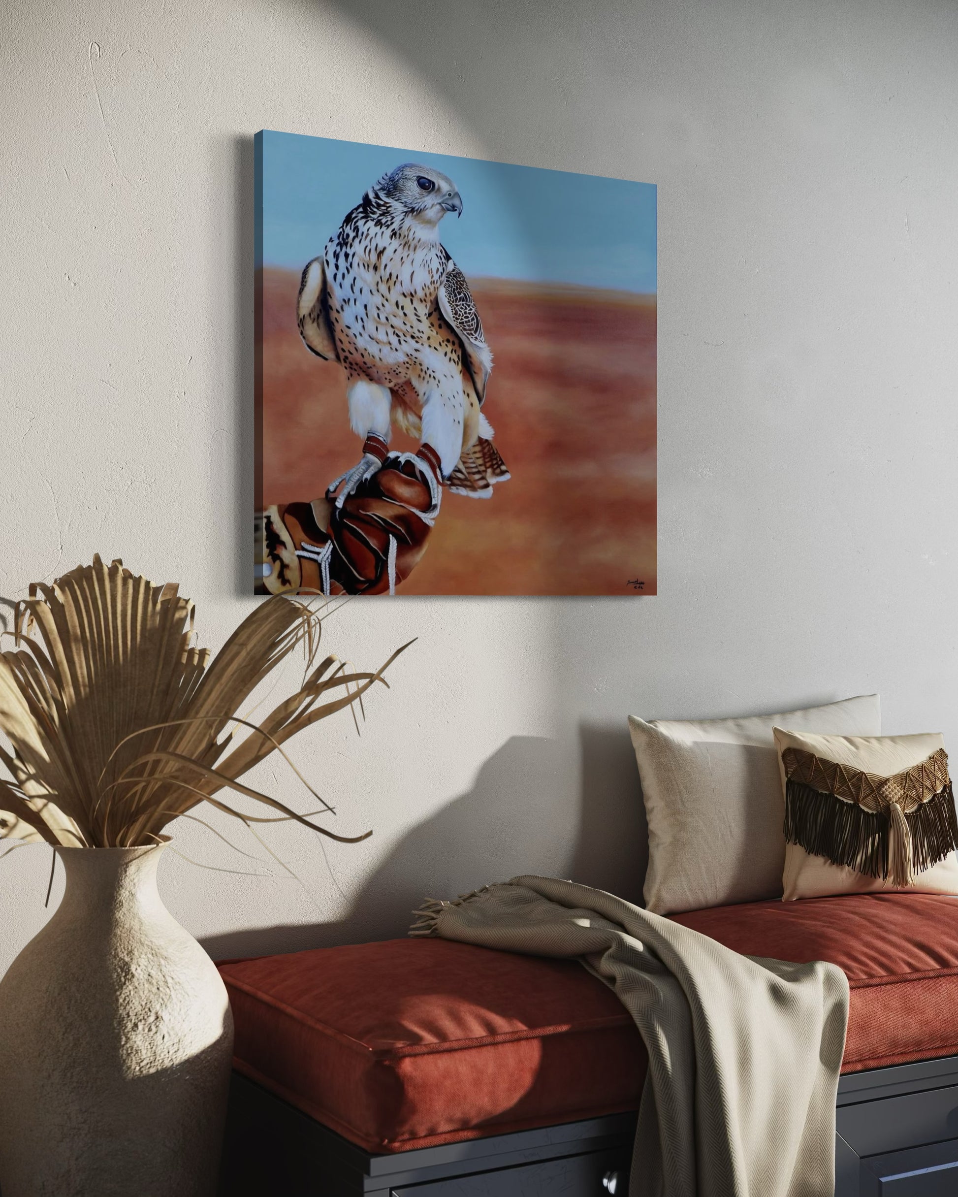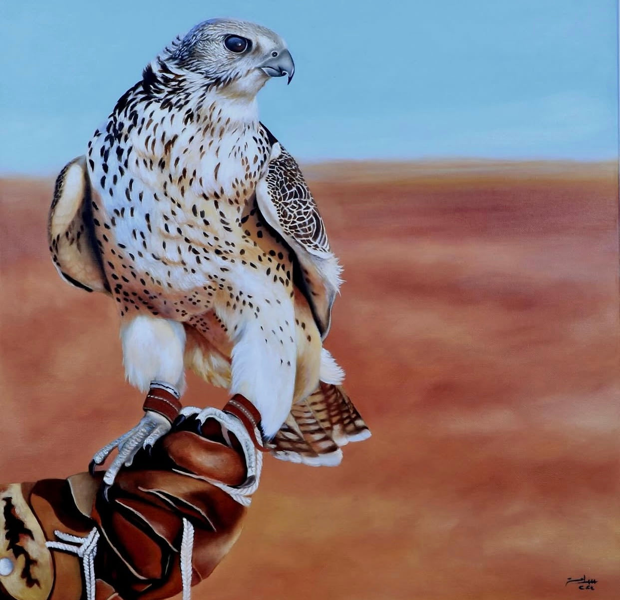This work depicts a majestic falcon perched on the falconer's hand with meticulous realism, highlighting the feather detail and sharp gaze amidst a warm desert background. The painting embodies the spirit of chivalry and traditional hunting, reflecting the symbolism of strength and freedom in Arab culture.