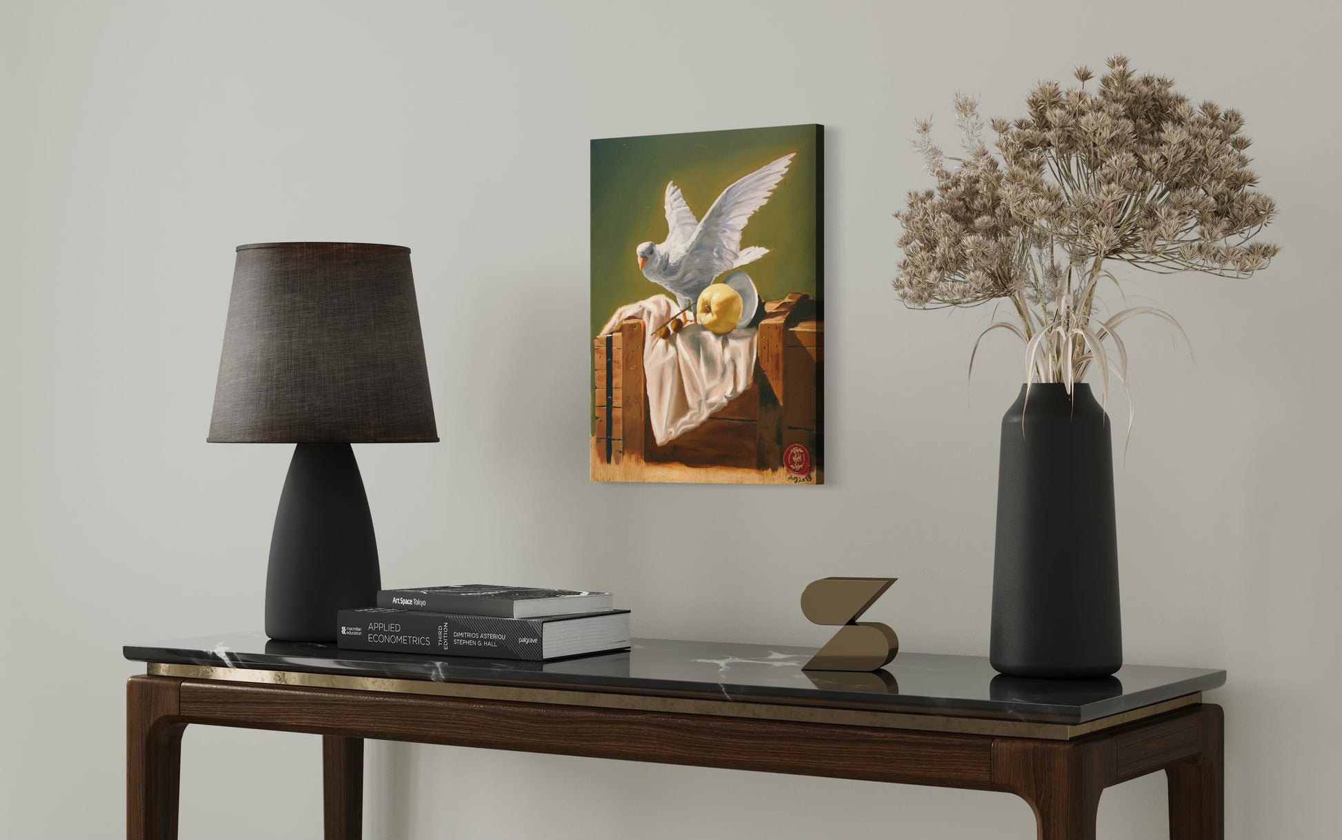 A classical-style oil painting blending still life elements with the symbolism of a white dove. The artwork captures a delicate balance between motion and stillness, purity and the beauty of everyday details.