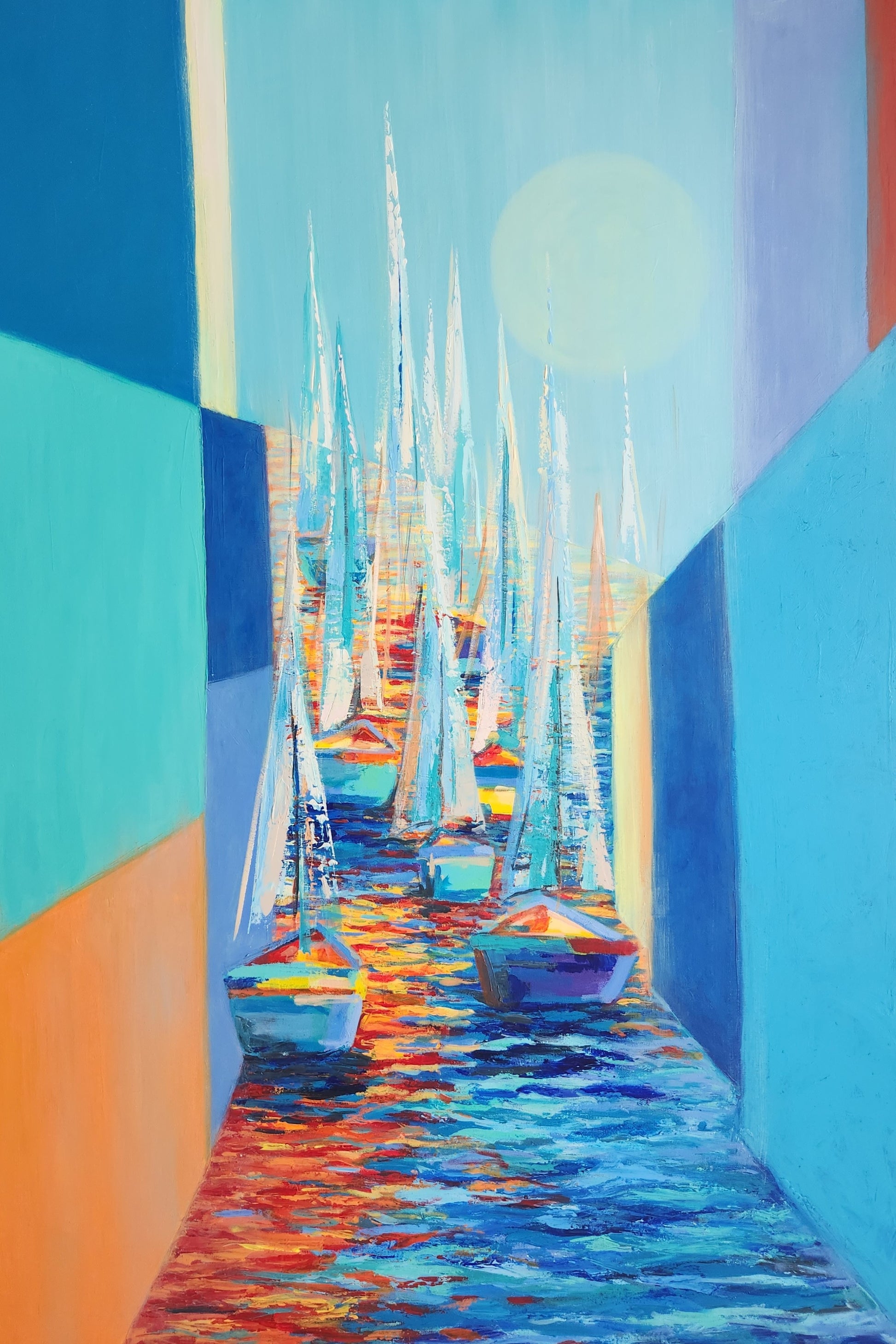 In my paintings, I use a vibrant color palette to bring the seascapes to life. The blues and greens of the ocean contrast with the warm yellows and oranges of the setting sun. The white sails of the boats stand out against the deep blue sky. These colors work together to create a sense of harmony and balance, reflecting the hope and optimism that I strive to convey through my art.