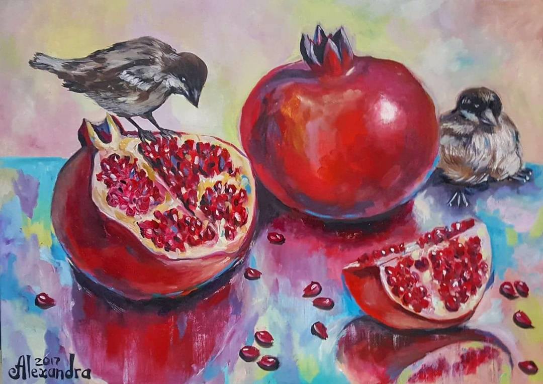 This vibrant still-life painting celebrates the harmony between nature’s simple beauties – the richness of ripe pomegranates and the delicate presence of birds.