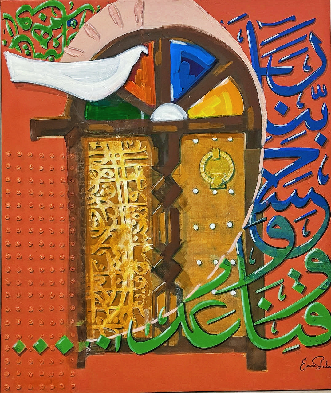 The artist adopted a symbolic style that evokes elements of Gulf heritage through traditional attire, jewellery, and Arabic calligraphy, while incorporating a traditional heritage door and a dove as a symbol of peace. At the heart of the composition, calligraphic forms weave a visual dialogue with the other elements. The use of vivid, clear colors lends the work a modern character that bridges authenticity with contemporaneity.,